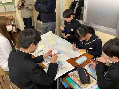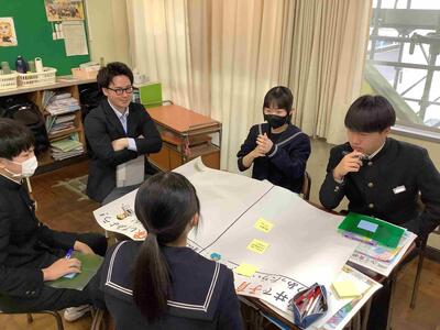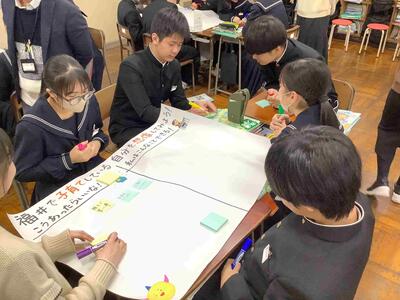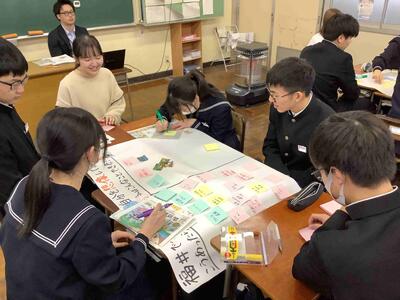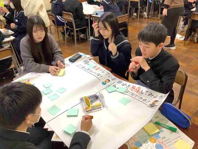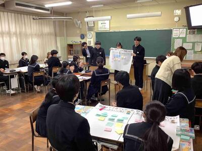 本日は、3年生の各クラスの家庭科で出前授業が行われました。県のこども未来課の職員、仁愛女子短期大学の先生と学生の方々が来られました。