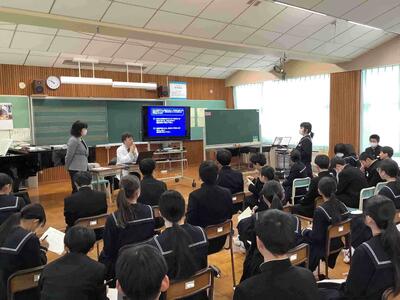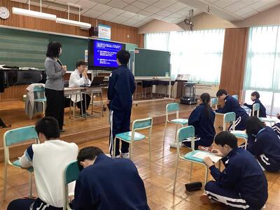 講師に、福井赤十字病院の吉田先生、秋山看護師さんに来ていただきました。授業では、がん治療などに関する話を聞いたり、ワークシートで個人やグループで考えたことを発表したりしました。みなさん、しっかり考えていましたね。