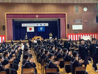 本日は、第75回の卒業式が行われました。3年生は卒業生として、また先輩として立派な姿を見せてくれました。1、2年生はしっかりとした態度と素晴らしい歌声で、式を盛り上げてくれました。とても感動的で素晴らしい式になりました。