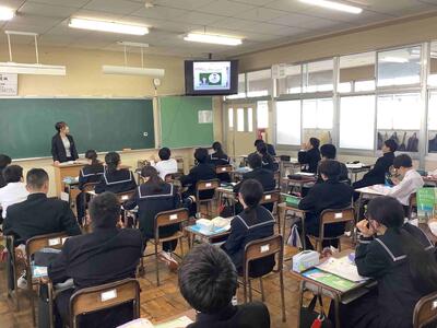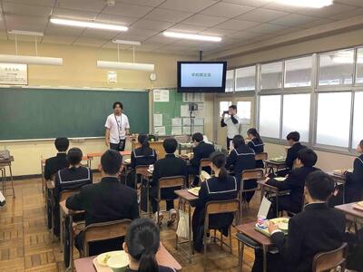 本日の給食の時間に、清水特別支援学校の伊藤先生に来ていただき、今年度の学校間交流についての説明をしてもらいました。